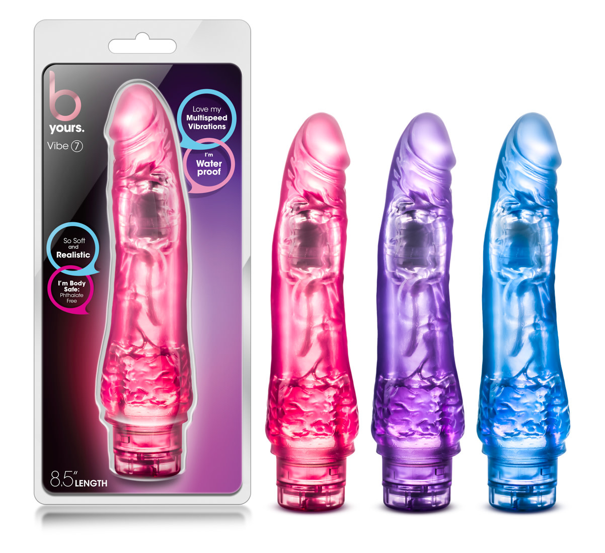 The B Yours Vibe 7 will rock your world. B Yours Vibe #7 is an 8.5 inch realistic vibrator with a prominent head. The twist dial base provides multispeed vibrations and is waterproof for shower and bath time. The perfect choice for a first time toy purchase and for the cost conscious. Made of fragrance and Phthalate Free PVC: this toy is body safe and easy to clean! Just wash with warm soap and water, or your favorite toy cleaner, before and after every use. Pat dry with a soft towel before storing.