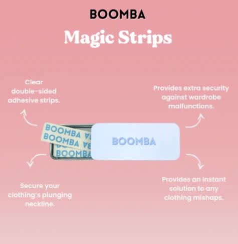 BOOMBA’s Magic Strips are clear adhesive strips that stick on both sides. They stick to your skin and to your clothing discreetly to provide an extra level of security against wardrobe malfunctions. Take the plunge with confidence, just peel, stick and go!