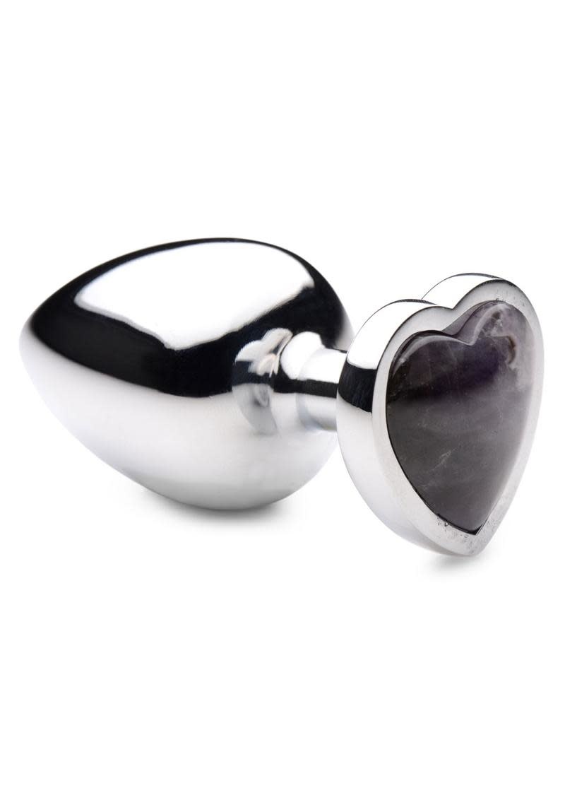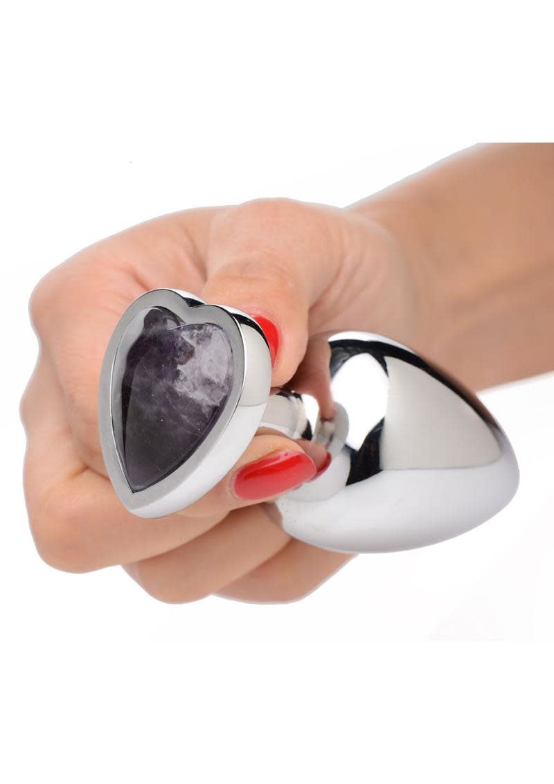 Decorate your derriere with the romantic relaxing energy from this genuine Heart-Shaped Amethyst Gem butt plug - balance your mood and clear negative thoughts while you fulfill your need for backdoor fill! The smooth and weighty texture provides a deeply satisfying mass of hardness for your butt to squeeze on, perfect for use on your own or as a warmup toy for further anal fun with a lover. Constructed with a body safe aluminum alloy that is easy to clean and compatible with most lubes so you can play with your favorite slippery stuff. Measurements: Overall length 3.7 inches, insertable length 3.2 inches, diameter at widest point 1.6 inches Materials: Aluminum alloy, Amethyst Color: Purple, metal Genuine Heart-Shaped Amethyst Gem: Provide a calming, soothing energy to your butt; the heart-shaped Amethyst gemstone balances your mood, and helps clear negative thoughts while you play Comfortably Weighted: Add a downward pull to your hole for additional stimulation and pleasure thanks to the weighty nature of these metallic butt plugs Nickel Free Aluminum Alloy: The aluminum alloy material provides a deliciously hard and smooth mass for your ass to squeeze; compatible with most lubes Great For Temperature Play: Warm or chill this gemstone butt plug in a bowl of water to add another layer of sensation while you play; perfect for veteran butt plug users looking for a new way to play