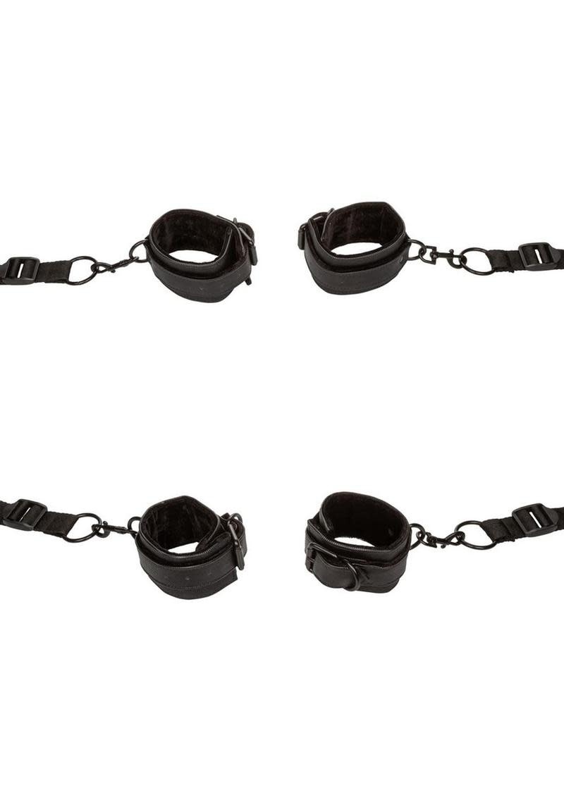 4 totally adjustable and detachable wrist or ankle cuffs with Velcro® style closures. 4 sturdy, adjustable tethers to fit most mattresses. May be used under any bed or as individual tethers. Universal clasps and O-rings with swivel design for full dexterity. Soft and plushy interior with a vegan leather exterior. Double padded, double stitched. Functional, durable and textured design.