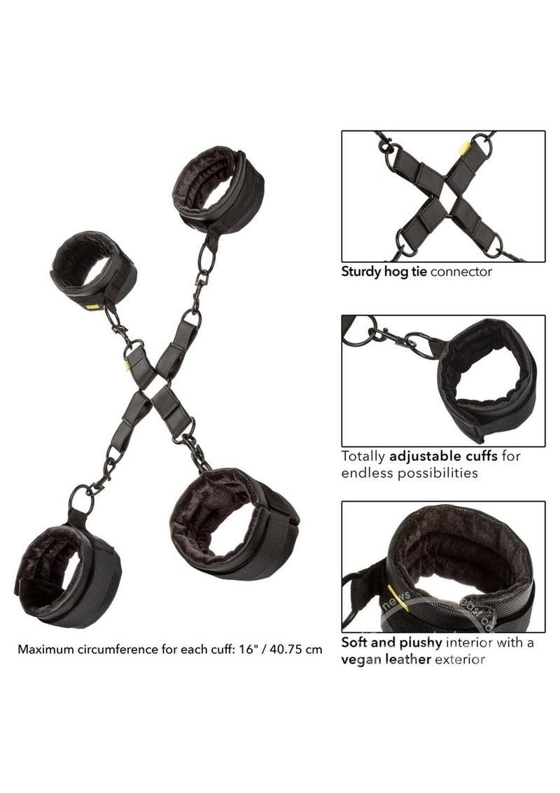 4 totally adjustable wrist and ankle cuffs. Fully adjustable with Velcro® style closures. Sturdy hog tie connector. Universal clasps and O-rings with swivel design for full dexterity. Soft and plushy interior with a vegan leather exterior. Double padded, double stitched. Functional, durable and textured design. Disassembles completely and may be used as individual wrist and ankle cuffs.