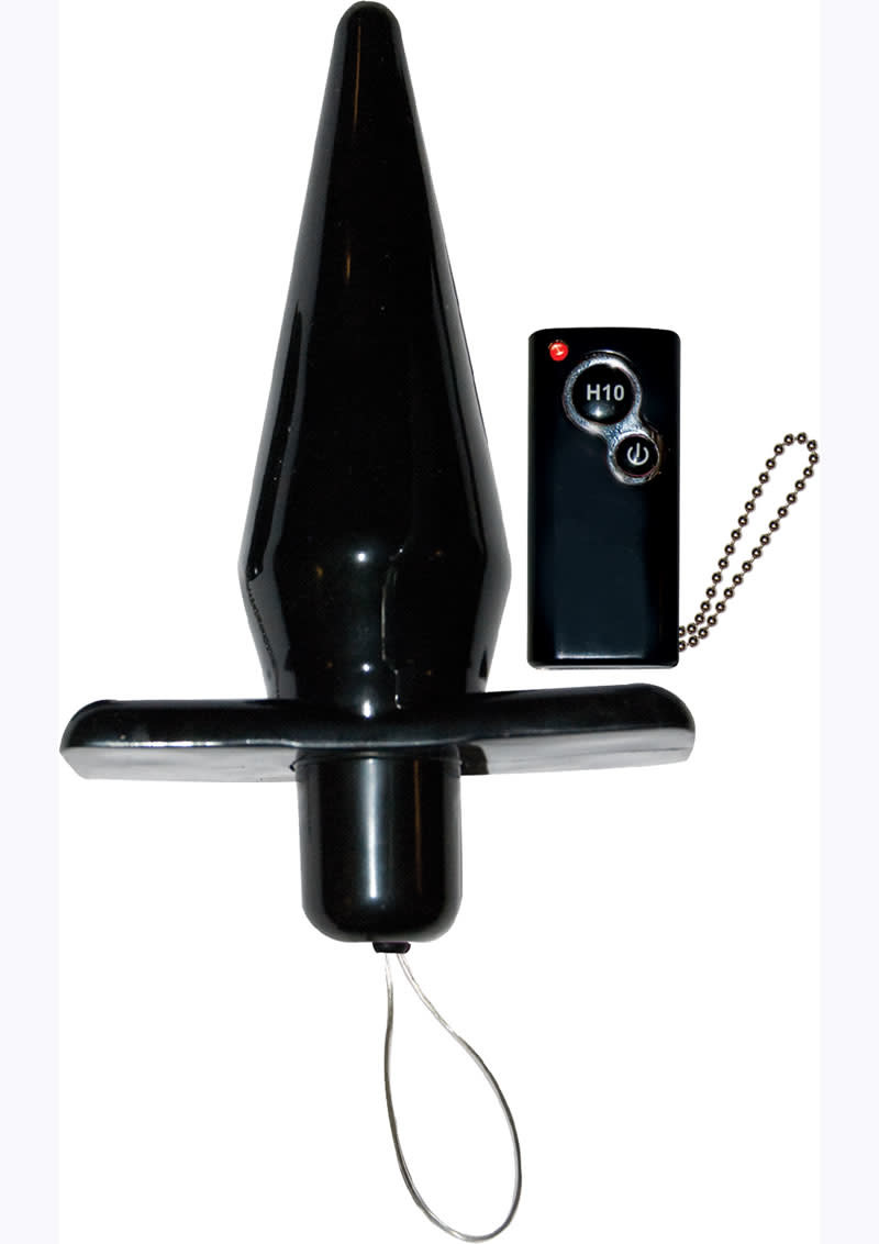 Power Butt Plug Remote Control Black. 10 functions, wireless remote control butt plug. Intense anal pleasure. Waterproof butt plug. Vibrator comes with a t-base to prevent toy from getting lost up there plus a handy retrieval cord for easy removal. A beaded chain keeps remote in hand. Made using phthalate free, non-toxic materials. RoHS compliant. Material: Butt plug SEBS, Remote ABS plastic with polyurethane PU coating. Vibrating sex toy requires 3 LR44 AG13 butt plug, 1 27A, 12V remote included. Butt plug measures 5 inches long by 4.5 inches in diameter. A water based lubricant is recommended. Power Butt Plug Remote Control Black from Nasstoys of New York.