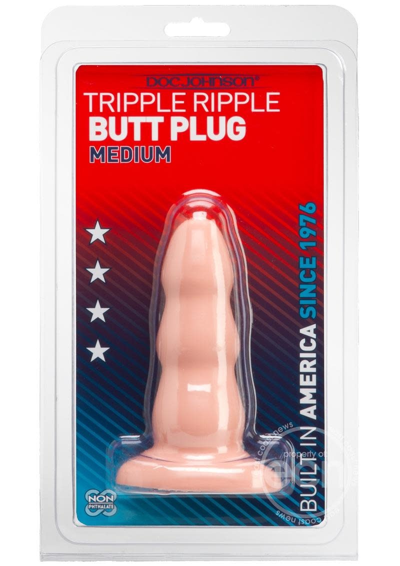 Three steps to anal satisfaction! Satisfy your desire for anal adventures with the 5" Medium Triple Ripple butt plug. This thick plug has a unique shape that starts off petite at the head then gradually widens and tapers into 3 big bumps for tons of sensation during insertion and removal. The wide base makes it safe, and compatible with an O-ring type harness. As with any anal toy, you'll want to use lots of lube. Water-based formulas works best with our rubber material. A clever addition to your toolbox, Doc Johnson's Triple Ripple is a medium size, graduated butt plug with three stages of bliss. As the shaft widens, each level gives a fuller and more stretched sensation. Triple Ripple Butt Plug Medium is step 2 in the series. Each level is a new challenge. There are three levels of pleasures. One size fits most. Butt plug measures 5 inches to 6 inches long by 1.75 inches wide. It is made from non-phthalate body safe material, which includes Doc's anti-bacterial formula. Made using phthalate free, non-toxic materials: Sil-A-Gel, PVC, Thermoplastic Rubber TPR. All new Sil-A-Gel formula. Antibacterial, non-toxic formula. Latex free, Cadmium free. Odorless. Safe for anal, vaginal, g-spot and prostate massage. Dongs, Dildos & Butt Plugs from Doc Johnson Novelties the Great American Toy Company. Made in the USA. 16