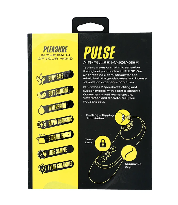 Pulse is a discreet little vibe that provides an entirely new sensation for solo play or partnered fun. This air pulse massager creates sucking pulses and fast taps right where you want them, while 7 intensity levels let you build up the pleasure at your own pace. The soft, ergonomic shape is easy to grip, and waterproof so you can take the fun into the shower. Rechargeable for endless play, with a storage pouch to keep things tidy when you've caught your breath. Pulse is ready to take your orgasms to a whole new level. Time to turn up the intensity!