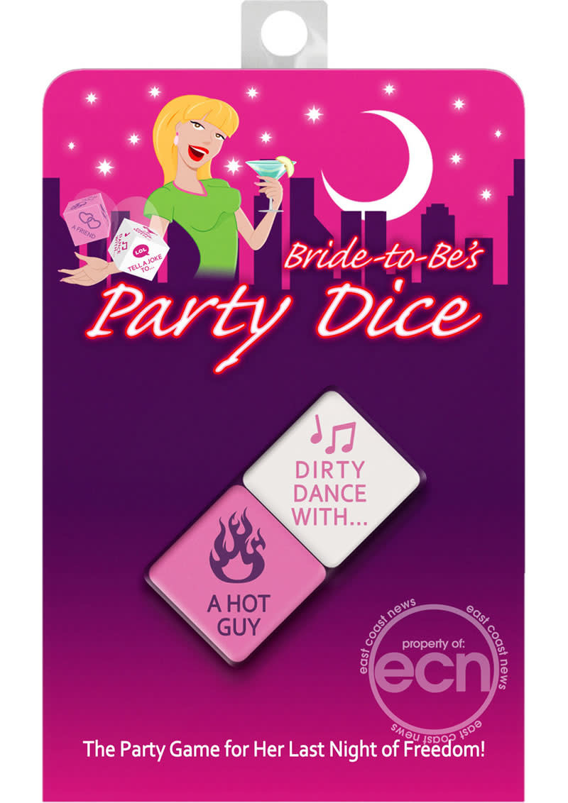 The party game for her last night of freedom! Players take turns rolling the dice and acting out the dares rolled WITH the bride-to-be. Dirty dance with a hot guy, drink with a big guy, imitate a friend, kiss a stylish guy, and much, much more. Includes: 2 party dice.