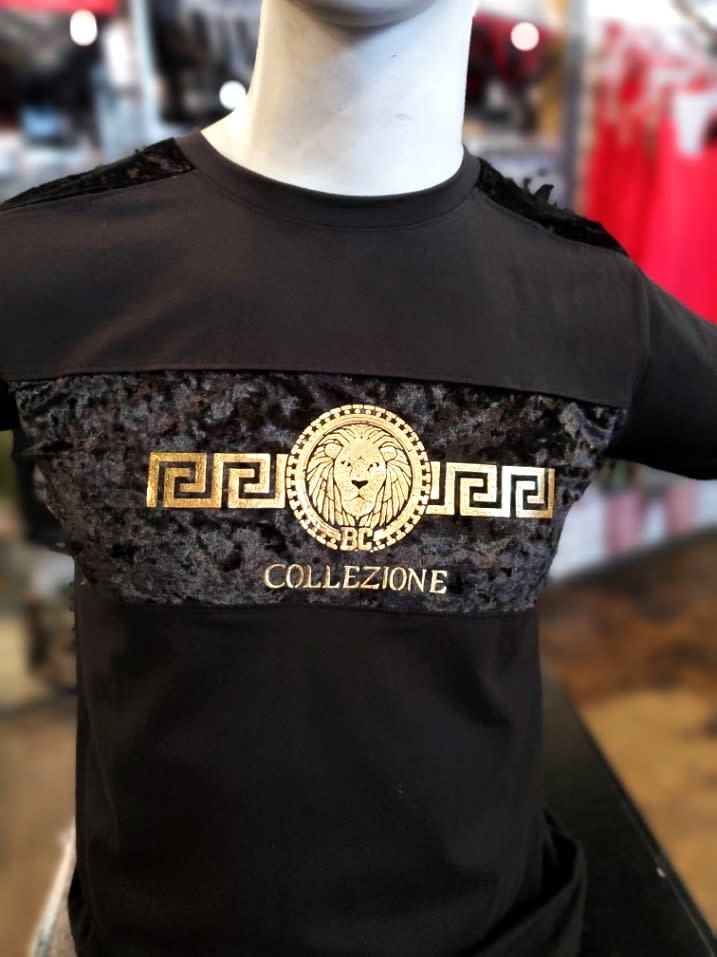 BUCHELI VELVET STRIPED GOLD LION PRINT T-SHIRT BLACK