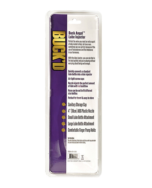 The Buck'd Lube Injector quickly converts most lube bottles into a lube injector and makes lubrication much easier. The injector which is great for trans men because of the dryness sometimes caused by the use of testosterone and the resulting imbalance in hormone levels. It's also something that many women going through menopause can benefit from if they are experiencing vaginal dryness. The 4” (10cm) interchangeable plastic injector comes with a small and large lube bottle cap. The injector has comfortable finger pump holds, that lets you inject the perfect amount of lubricant with no back flow. The injector also comes with a sanitary storage/travel cap. The hose attachment can be cut to fit multiple size bottles.? • Sanitary Storage Cap • 4” (10cm) Plastic Nozzle • Small Lube Bottle Attachment • Large Lube Bottle Attachment • Comfortable Finger Pump Holds