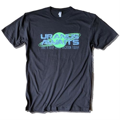 "Uranus Awaits, Take a Deep Space Vacation Today!" printed in 2 colors on black T's. It's actually 4 colors, the first color is a base layer of light grey behind the whole graphic, then the lime green, then the darker blue grey, but right before I print the last color I drizzle some pearl blue ink back and forth across the screen over the letters, then I do a flood coat of the ink and then print, the result you can see in the images, the pearl ink stays where I painted it and makes for a unique spacey look.