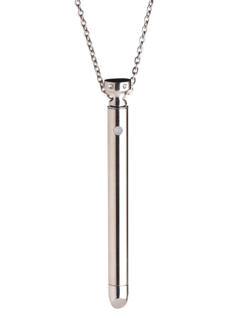 Dare to wear your favorite vibrator right around your neck! The sleek, sexy and stunning metal and rhinestone gem vibrator is made of nickel-free metal for sensitive skin and packs powerful vibrations. Choose from 7 different vibe patterns that you can feel along the shaft and in the pinpointed, smooth, round tip. Recharge using the toy-specific, USB charging cable when not in use. Wash with warm water and soap, then spray with a toy cleaner and wipe dry.