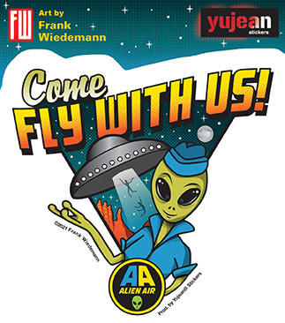 Come Fly With Us 4.5 x 4.5" sticker. Art by Frank Wiedemann.