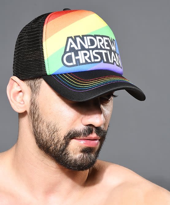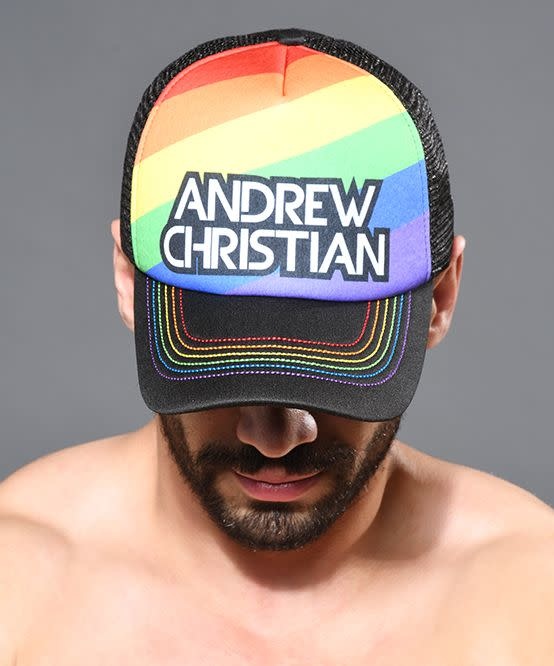 It's time to show your pride! Meet our latest sexy accessory, the cute new Pride Cap. Our classic trucker hat comes reimagined with a fun limited-edition rainbow design with bold Andrew Christian lettering and iridescent contrast stitching. Pair with matching undies, or wear nothing but this cap. We're not complaining!
