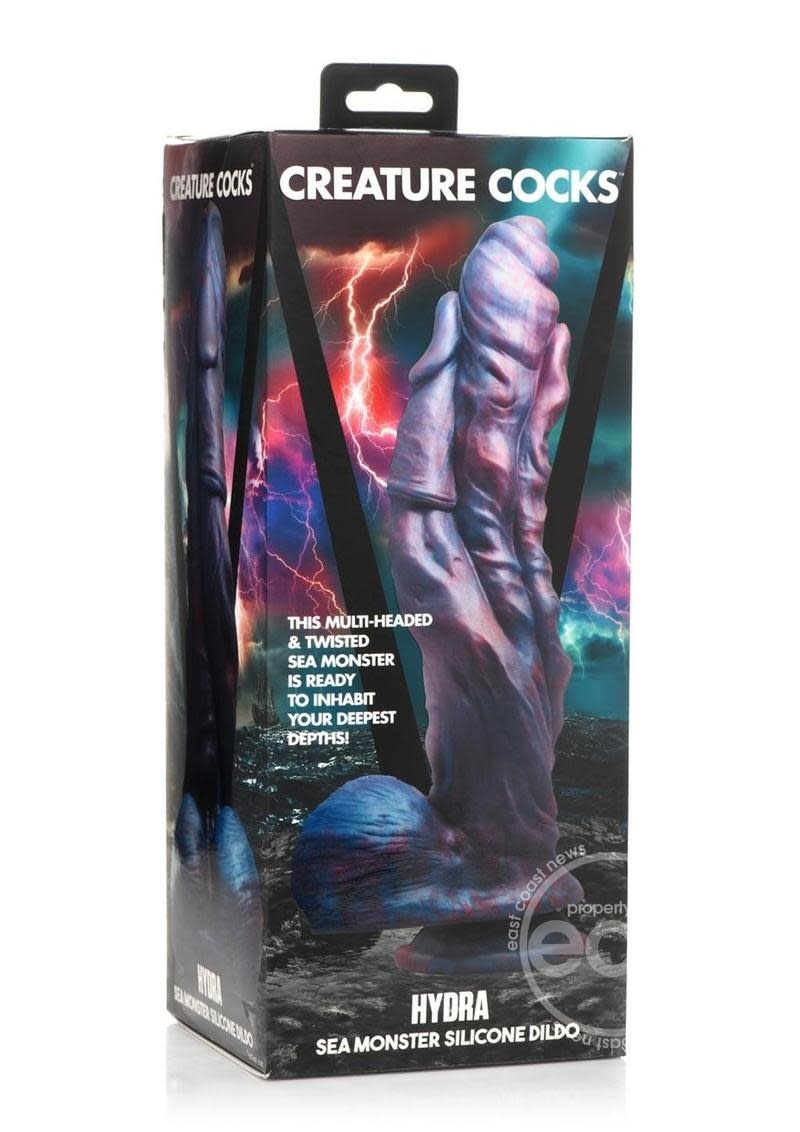 This salty sea monster comes with three heads ready to please and penetrate you! The dark blue and red colors swirling to make an even deeper purple add to the mystical look of this Hydra Sea Monster Creature Cock. The two smaller heads twist around the large one in the center offering different points of pressure and varying textures as it goes deep inside. At the base are a large pair of balls to match this massive 10 inch dildo. Made of premium silicone, it is firm and flexible with a soft, smooth surface. It's completely body-safe and phthalate-free but must only be used with water-based lubricants. At the wide base below the balls is a strong suction cup that can be placed on any flat surface or hands-free rides. The wide base doubles to make it a strapon compatible dildo, too! Pair it with your favorite strapon harness for pegging play! Perfect for kinky cosplay, fantasy roleplay and for just adding a little more fun and variety to your toy collection! After use, wash with warm water and mild soap, then rinse and spray with a toy cleaner before patting dry. Store separately from other silicone toys out of direct sunlight.