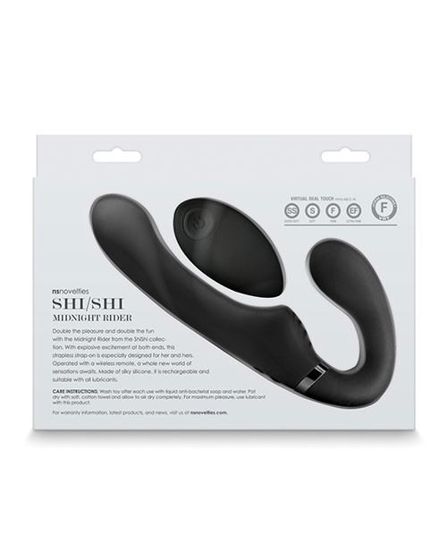 Double the pleasure and double the fun with the Midnight Rider from the ShiShi collection. With explosive excitement at both ends, this strapless strap-on is especially designed for her and hers. Operated with a wireless remote, a whole new world of sensations awaits. Made of silky silicone, it is rechargeable and suitable with all lubricants. USB rechargeable. Product Dimensions: TOY: 8.39 x 1.5 x 3.74 RMT: 2.98 x 1.61 x 0.87 (Inches) Insertable Dimensions:1: 5.51 x 1.42. 2: 4.33 x 1.34 (Inches) Product Material: SILICONE/ABS