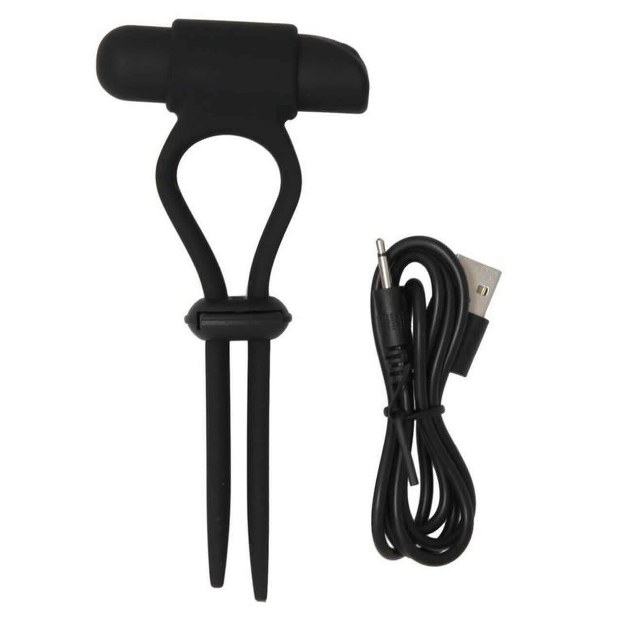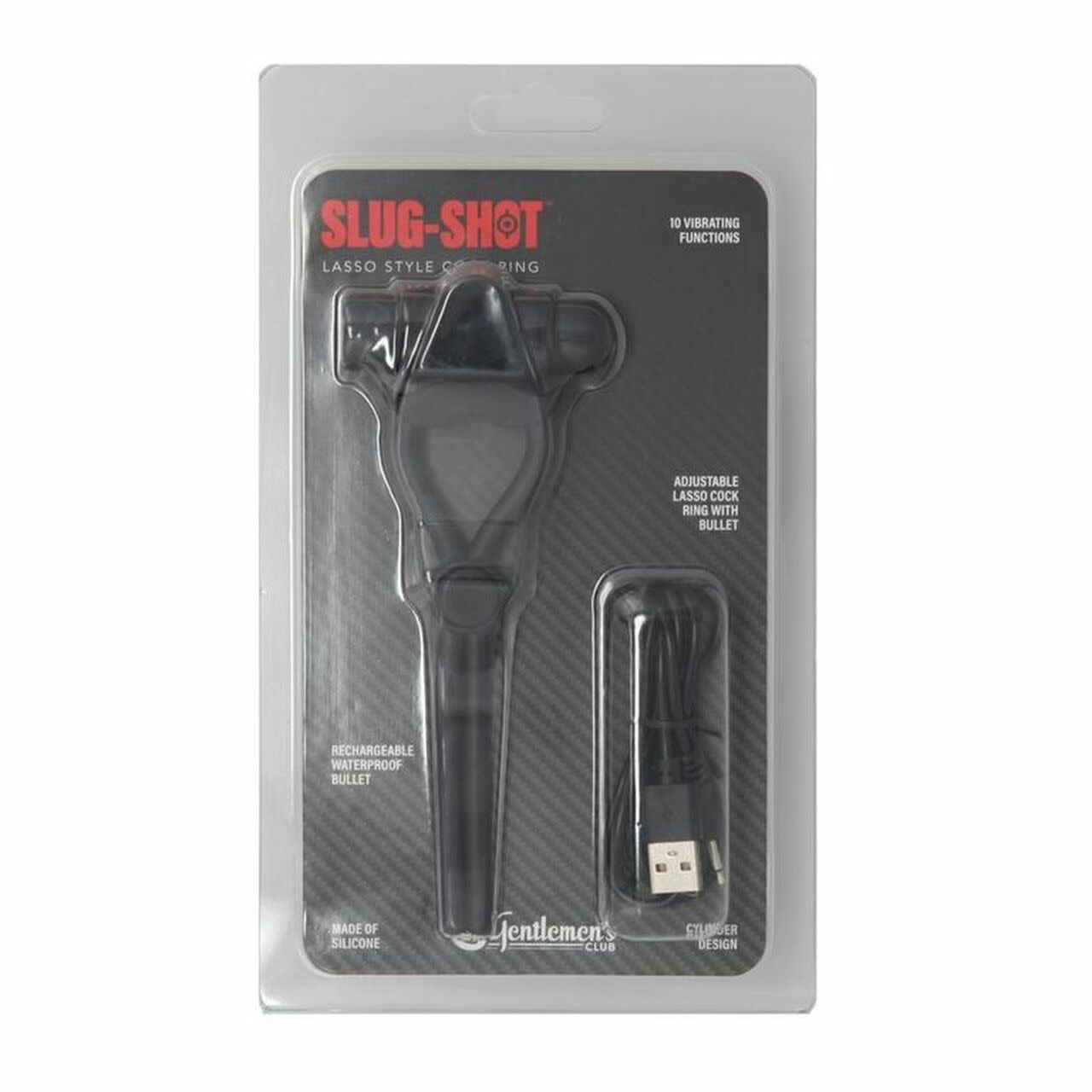 Improve your pleasure experiences with improved-upon designs like the Slug Shot vibrating constriction lasso! Completely adjustable, simply tighten the ring by pulling the "tails" through the plastic push-lock. The removable bullet vibrator provides 10 vibration patterns and is inserted into a tunnel through the upper outer massager, finished with a cute mustache detail on the front!