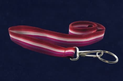 These Lesbian Sunset Flag lanyards are striped with the colors of the Lesbian Sunset Flag. The stripes represent gender non-conformity and are dark orange, orange, light orange, white, pink, dusty pink, and dark rose. Great to wear for to show your support for the Lesbian community. The woven fabric portion of the lanyard is 17 inches long x 3/4 inch wide.