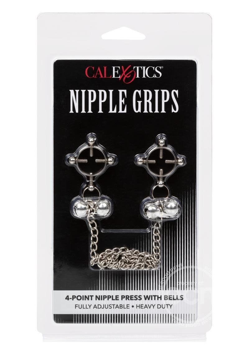 Includes 2 fully adjustable multi-use clamps. Screw-down 4-point press with fully adjustable screws. Bells and chain for added sensuality. Heavy-duty metal. Non-tarnishing, nickel-free.