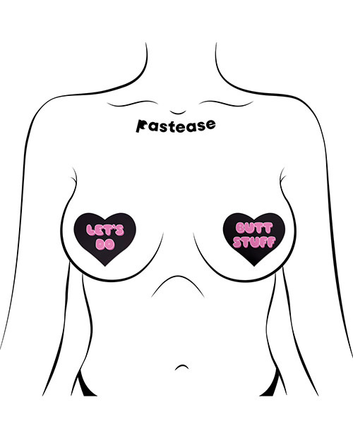 love: 'let's do butt stuff' in black & pink heart nipple pasties by pastease® are hand-made in the usa of soft form-fitting material that forms to curves and resists wrinkling over hardening nipples. just peel-and-stick on clean, dry skin! all pastease® pasties feature latex-free, medical-grade, waterproof adhesive that stays securely in place for as long as you like and until they are gently removed. conceal or reveal with pastease® nipple pasties when worn with a sexy outfit, daring bikini, sheer top, revealing dress, hefty bag, body lotion, crazy costume, party theme or nothing at all!