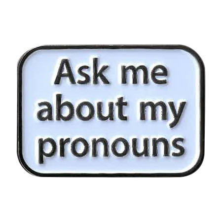 It's a sign of good times: "Ask Me About My Pronouns", in this top quality 1.25 x .875" enamel pin.