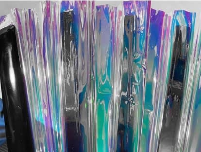 Slightly see thru tinted and iridescent vinyl, shows different shades of color at different angles, great for pride, festivals, ETC. 13 inches long and measures 25 inches across when its open (normal size for gay clack fans) Spines are black painted bamboo. front is a beautiful silver, light purple and light pink with undertones of gold, back is a beautiful ivory pearl with gold undertones! These do not clack as loud as the printed fabric ones, but still make a good sound.