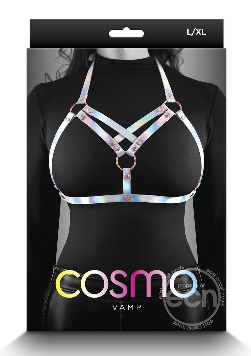 Dress up your assets with Cosmo’s stylish chest harness. Accented with rose gold nickel-free hardware and adjustable straps for the perfect fit. Made from easy to clean vinyl. Cosmo harnesses are available in a variety of styles and sizes.