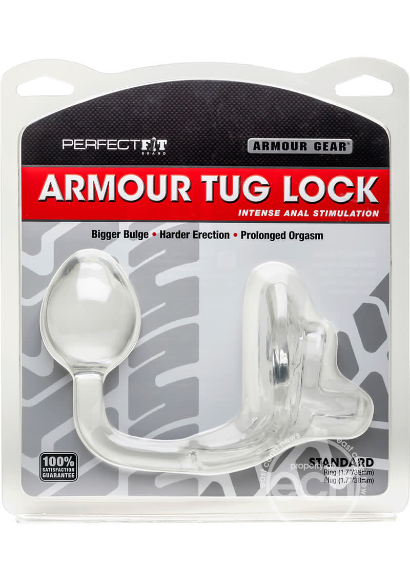Armour Tug lock features the Armour Tug cock ring which is attached to a butt plug with a 5.5 inches circumference for added stimulation. The strap gives the user an amazing separation of your penis and scrotum while giving a bigger lift. It is designed with a revolutionary anatomical shape that hugs your torso and pushes your gear out entirely from your body to enhance your penis and scrotum. Armour Tug Lock is made of Perfect Fit Blend which is a proprietary blend of Silicone and Thermoplastic Rubber TPR developed to provide superior stretch, comfort and durability. Armour Tug Lock comes in the standard 1.7 inches size. Safe with water based lubes. Wash thoroughly with mild soap and water. This product is not compatible with latex products. Store separately. Perfect Fit Brand Products are sold, and intended for use strictly as adult novelty toys for entertainment. They are not intended for medical use and have not been clinically tested. No medical claims are warranted or implied by the use of these products. Color: Clear.
