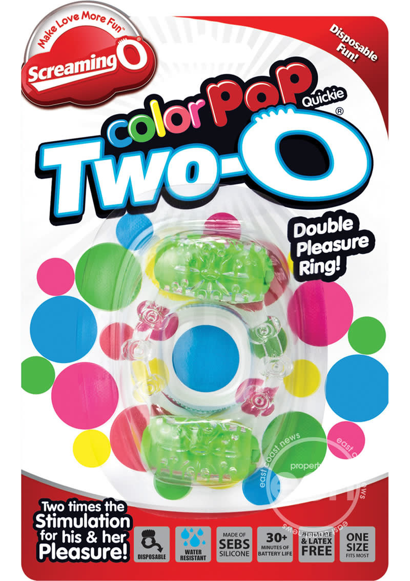 The Two-O Double Pleasure Vibrating Ring features two super powered, super bright mini motors attached to a stretchy and comfortable pleasure ring for better, more satisfying sex. The top motor stimulates her clitoris while the bottom motor buzzes strong for mutual pleasure, giving couples something to scream about together! Now available as a convenient Color Pop Quickie, couples can enjoy vibrant vibration at home or on the go with a disposable design they can take anywhere! Features: two long lasting motors for his and her pleasure. Intense vibrating ring with super-stretchy band. Pleasure ticklers for increased clitoral stimulation. Pleasure knobs around the ring boost his experience. Two easy on/off switches. Additional information: disposable. 30+ minutes battery life. One size fits most. SEBS silicone. Latex free. Phthalate free. Wireless vibrations. Water resistant for shower use only. Color: Green. Video