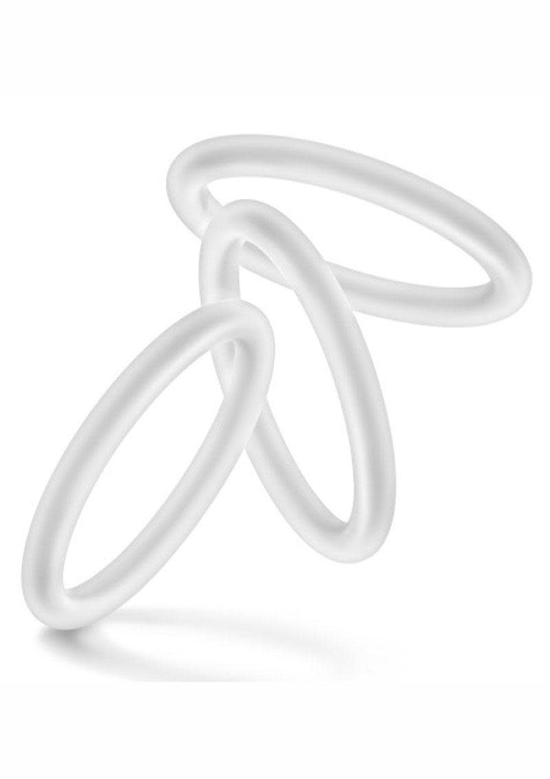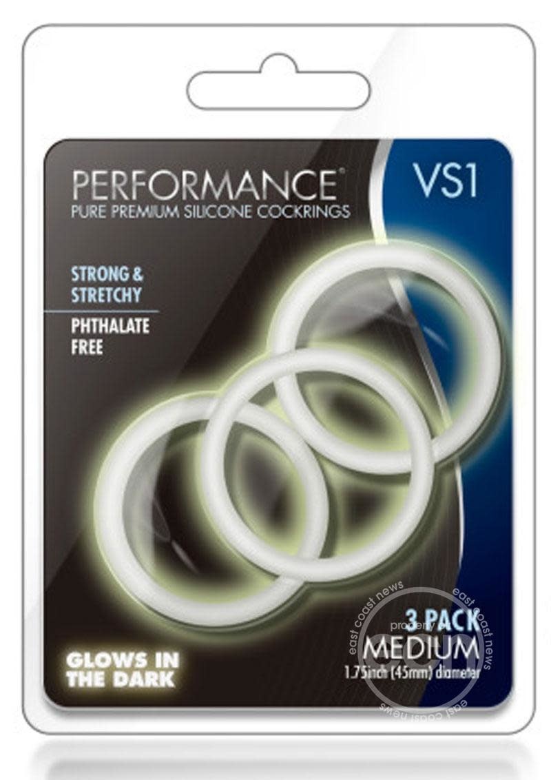 Performance VS1 Pure Premium Silicone Cock Rings Medium White from Blush Novelties. Strong - high tensile strength Silicone resists snapping. Comfortable - just the right blend of taut and stretchy. For a comfortable yet effective fit. Choose the size that fits you best. Glows in the dark. Put it under a moderate to bright light source for 5 minutes to get it Glowing In The Dark. Peace of mind - made of body safe Silicone. Contains no synthetic fragrance or latex. It meets or exceeds International product safety standards. As always do not use products made of a soft Silicone based lubricants or petroleum based products such as baby oil or Vaseline. It will degrade the Silicone. Diameter 1.75 Inches. Can be stretched a little over twice its original diameter. Perform like a porn star with our pure premium silicone cock rings from Performance, a brand you can trust. Stay harder and longer with these male enhancement rings that are a blend of taut and stretchy. It can be stretched up to twice its original diameter. With 3 rings to use, wear 1 to increase your sexual stamina or wear multiple cock rings around your cock. Or share them with your partner.