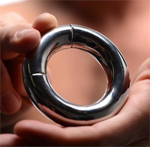 Weighing in at a whopping 7.5 oz, this ball-stretcher will get the job done simply with the sheer force of gravity! Made of highly durable stainless steel, this heavy ring will pull down on your scrotum to create a unique sensation that will amplify a sexual experience on your own or with a partner. The powerful magnetism within the ring allows it to easily open and securely close. This attractive and distinct accessory is compatible with all types of lubricant and cleans with mild soap and warm water.