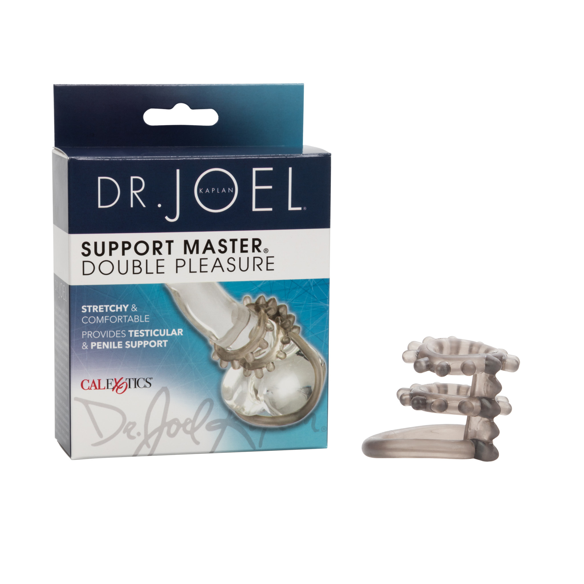 Dr. Joel Kaplan Support Master Double Pleasure Rings increase stamina! Stretchy and comfortable erection enhancers provide testicular and penile support. Extend your intimate performance satisfaction with the Dr. Joel Kaplan Support Master Double Pleasure. The sensual enhancer provides combined penile and testicular support for intensified orgasmic delight and hands free placement. The exotic erection keeper is endorsed by Dr. Joel Kaplan and is suitable for first time and experienced users. The super stretchy Dr. Joel Kaplan Support Master Double Pleasure measures a discreet 1.75 inches by 2.5 inches and is made from ultra soft, unscented phthalate free Thermoplastic Rubber TPR. The enhancer is comprised of 3 pliable rings that comfortably stretch around the scrotum and penis shaft. The double penis rings are erotically studded with tantalizing sensuous pleasure nubs that heighten sensitivity and maximize your orgasmic enjoyment. Slip the support ring on the erect penis and indulge in unlimited intimate play. The versatile Dr. Joel Kaplan Support Master Double Pleasure is designed for comfort, stamina support, and erection maintenance. The easy to use cock ring elevates your seduction satisfaction by maintaining a rock hard erection for prolonged play. Use the enhancer during couples foreplay fun or while indulging in self gratification ecstasy. To increase the pleasurable tingles and sensations, always use a quality lube with this toy. Before and after play, clean the erection enhancer with a toy cleaner spray or mild soapy water. Please note the package is changing, not the product. 17
