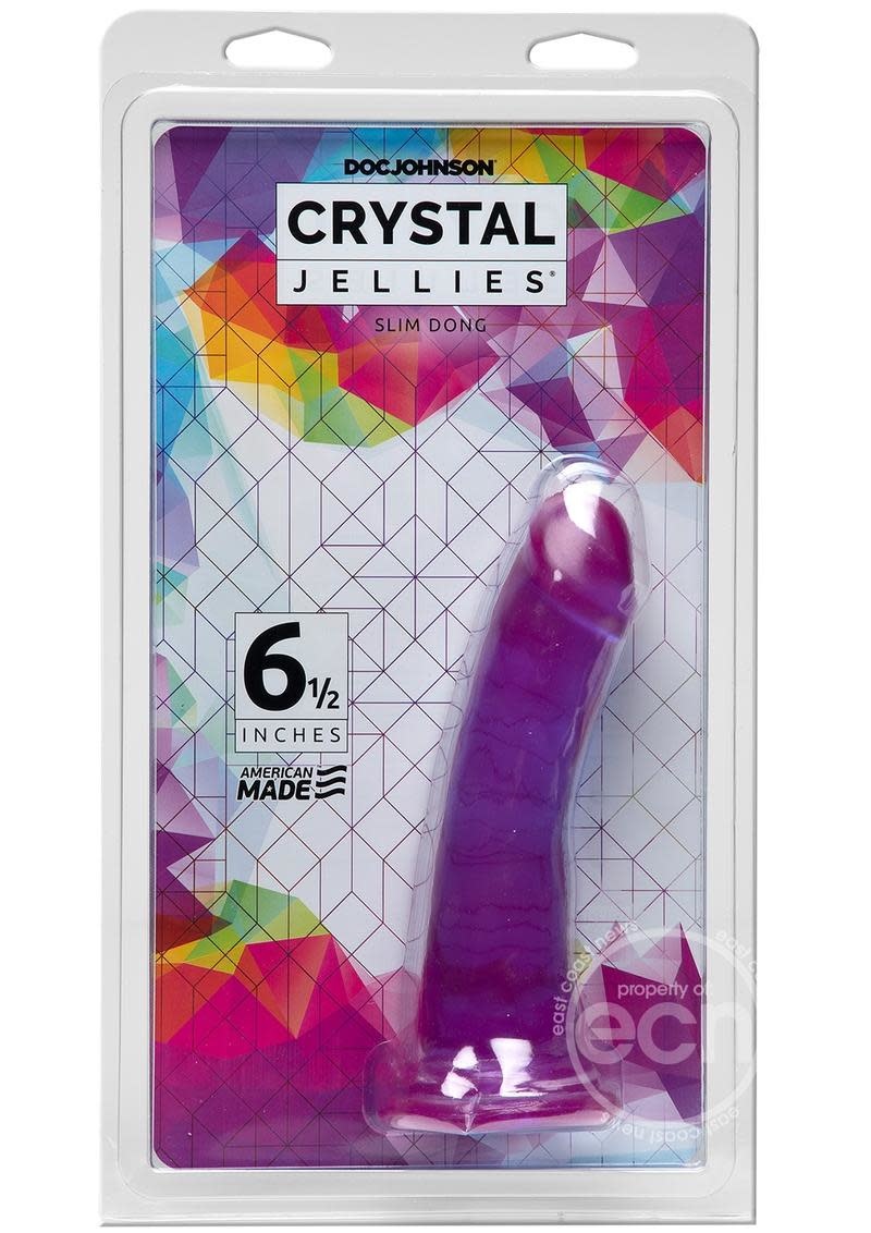 Crystal Jellies Slim Dong 6.5 inches Clear from Doc Johnson. The Crystal Jellies 6.5 inches Slim Dong features a smooth, stream lined phallic shape in one of Doc Johnsons most popular slim widths. The sheer body safe material shimmers in an assortment of beautiful crystalline tones from the firm rounded head to a built in suction cup base that seamlessly enables hands free fun. Our crystal balls predict pure pleasure in your future. Features: popular slim design. Smooth shaft, realistic head. Suction cup base for hands free play. Specifications: UPC Code 782421073152. Total length 6.5 inches. Insertable, usable length 6 inches. Width, diameter 1.5 inches. Circumference 5 inches. Body safe materials PVC. Made in the USA.