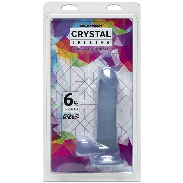 Crystal Jellies 6.5 inches Slim Cock with Balls Pink Dildo from Doc Johnson. The Crystal Jellies 6.5 inches Slim Cock with Balls features a smooth, phallic shape in one of Doc Johnsons most popular slim widths. The sheer body safe material shimmers in an assortment of beautiful crystalline tones from the firm rounded head to the sculpted balls. The wide base of this product ensures safety during any kind of play, while a built in suction cup base seamlessly enables hands free fun. Our crystal balls predict pure pleasure in your future. Features: popular slim design. Smooth shaft, realistic head. Suction cup base for hands free play. O-Ring harness compatible. Body safe materials PVC. Specifications: UPC Code 782421073268. Total length 6.5 inches. Insertable, usable length 5.5 inches. Width, diameter 1.5 inches. Circumference 5 inches. Made in the USA.