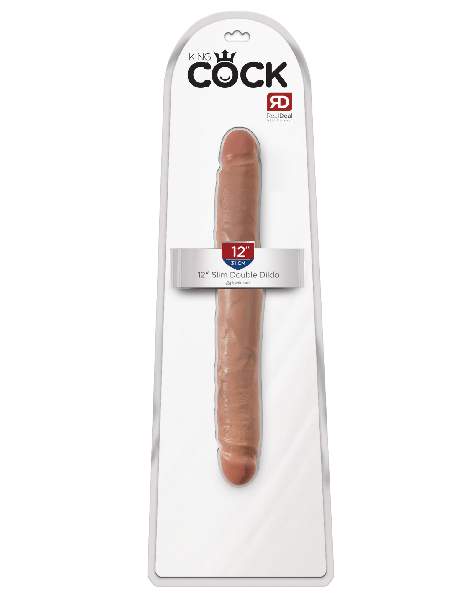 King Cock 12 inches Slim Double Dildo Tan Real Deal RD. Do you want your first dildo to look and feel just like the rock hard stud you have always fantasized about? Stop dreaming and get down with the King! Every vein, every shaft, and every head is carefully hand crafted with exquisite detail to give you the most realistic experience ever imagined. Made in PVC. Every King Cock is phthalate free, latex free, body safe and hypoallergenic. Enjoy every master piece with confidence. Total length 12.25 inches, width 1.5 inches, girth 4.25 inches. Vaginal insertion length 4.25 inches. Anal insertion length 4 inches. Bulk weight 10.5 ounces.19 Real Deal RD.