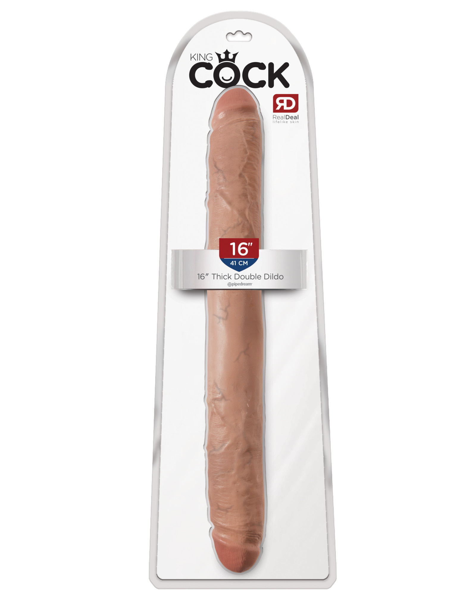 King Cock 16 inches Thick Double Dildo Tan Real Deal RD. Do you want your first dildo to look and feel just like the rock hard stud you have always fantasized about? Stop dreaming and get down with the King! Every vein, every shaft and every head is carefully hand crafted with exquisite detail to give you the most realistic experience ever imagined. Every King Cock is latex free, body safe and hypoallergenic PVC. Enjoy every masterpiece with confidence. Total length: 16 inches, width 1.75 inches, girth 5.5 inches. Vaginal insertion length 6 inches. Anal insertion length 6 inches. Bulk weight 1.75 pounds. 19 Real Deal RD.