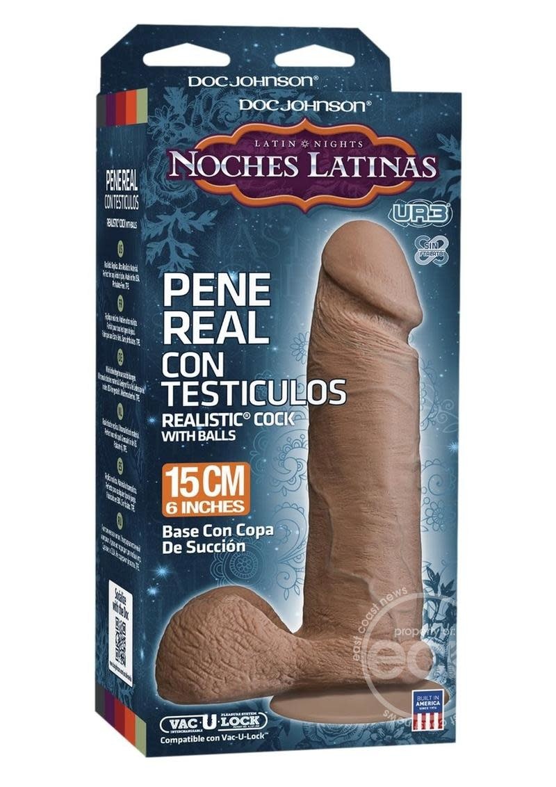 This beautiful six-inch caramel-colored cock will bring you to new levels of sexual satisfaction! The Noches Latinas ULTRASKYN Pene Real Con Testiculos was developed with a groundbreaking dual-density formula. The realistic cock and balls are formed with two layers, hard on the inside and soft on the outside, for the most realistic experience available. The Noches Latinas 6” Pene Real even warms to the touch and recovers its shape just like a real cock! The suction cup is removable and also makes this cock Vac-U-Lock and O-Ring compatible. All Noches Latinas packaging is written predominantly in Spanish and marketed for Spanish-speaking toy users. Proudly Made In America.