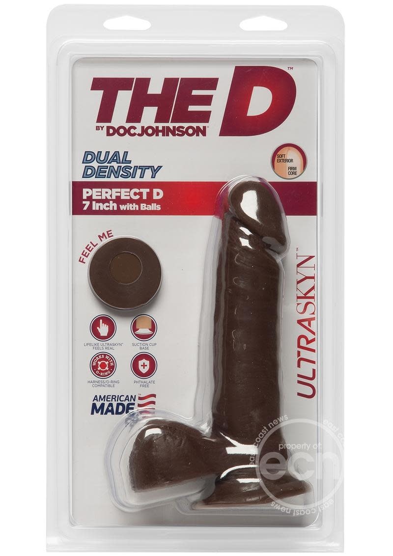 The D by Doc Johnson Perfect D 7 inches Chocolate Brown Realistic Dildo. Everybody wants it! Molded from a real erect penis, the lifelike texture and proportions of the dual density Ultraskyn Perfect D 7 Inches offer the most realistic look and sensation imaginable. The Perfect D is handcrafted to form the ideal balance between the soft, plush exterior and firm inner core that makes this collection so unique, and warms to body temperature with use. A strong suction cup base that affixes to most flat surfaces allows hands free use, completing the realistic experience. The D by Doc Johnson is an exciting collection of their best selling shapes, re imagined in life like dual density Ultraskyn. Doc Johnson is committed to keeping the quality high and the prices affordable, so everybody can get The D. Specifications: UPC Code 782421058913. Total length 7 inches. Insertable, usable length 6.5 inches. Width, diameter 1.75 inches. Circumference 5.5 inches. Suction cup base harness compatible stretchy o-rings. Material Thermoplastic Elastomers TPE.