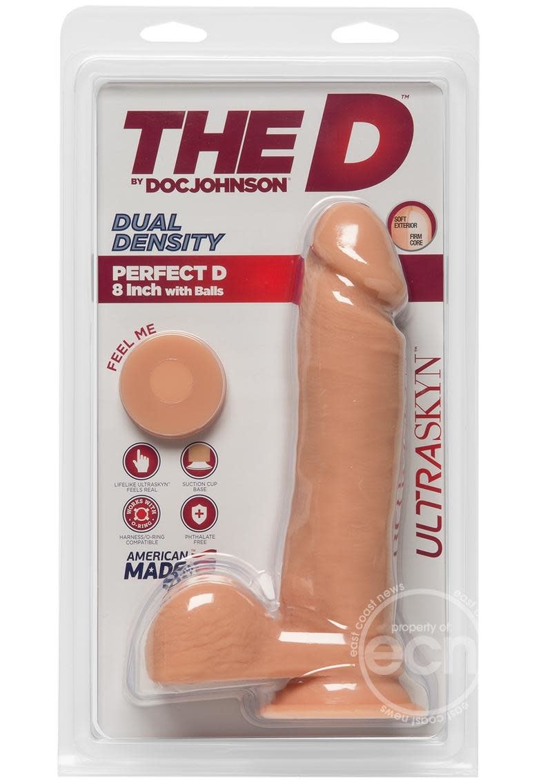Everybody wants it! Molded from a real erect penis, the lifelike texture and proportions of the dual density ULTRASKYN Perfect D 8 Inch offer the most realistic look and sensation imaginable. The Perfect D is handcrafted to form the ideal balance between the soft, plush exterior and firm inner core that makes this collection so unique, and warms to body temperature with use. A strong suction cup base that affixes to most flat surfaces allows hands-free use, completing the realistic experience.The D by Doc Johnson is an exciting collection of our best-selling shapes, reimagined in lifelike dual density ULTRASKYN. Weve committed to keeping the quality high and the prices affordable, so everybody can get The D.