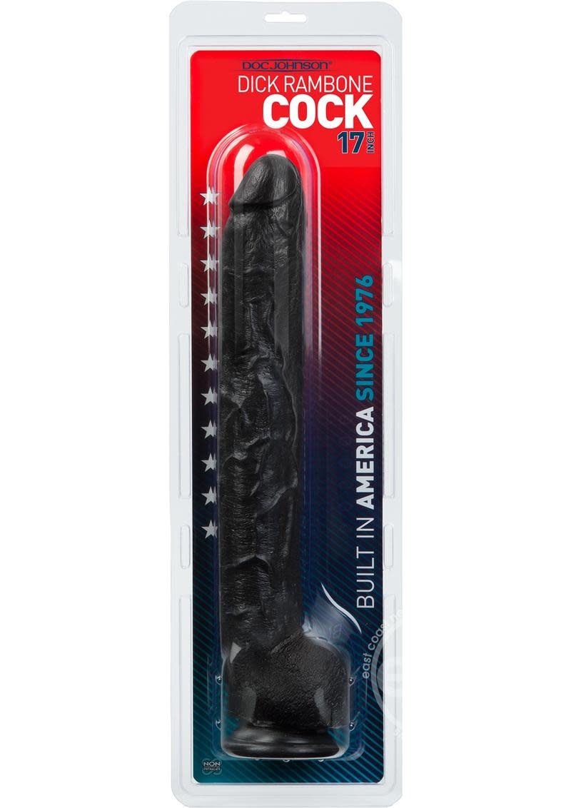 Doc Johnson's Dick Rambone Cock is an enormous dong that will never leave you wanting more. Molded from the eponymous porn star, famous for his well-equipped tool, this monster cock with veined shaft will fill users an amazing 17 inches deep. Brave the Rambone hands-free with the dependable suction cup base, or partner up for extreme strap-on harness play. It is made from phthalate-free body-safe material. Available in Black and White. Proudly Made in America