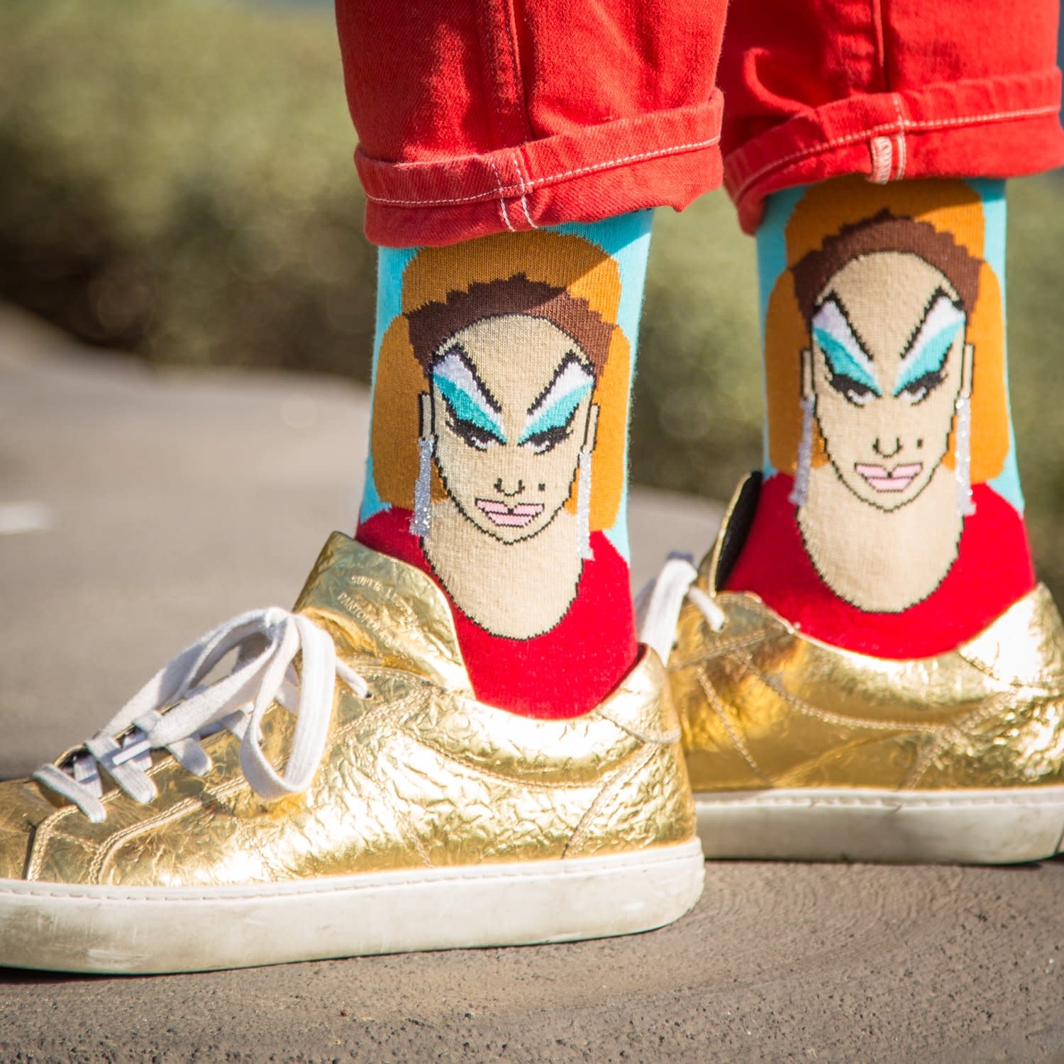 One of the most recognizable and celebrated counter-culture artists, Divine appeared in numerous films, most notably those of John Waters (including Pink Flamingos, Female Trouble, and Hairspray)... and now appearing on these Gumball Poodle exclusive socks! She is widely viewed as a hero in both gay and punk culture, as well as one of the most significant drag queens of all time.