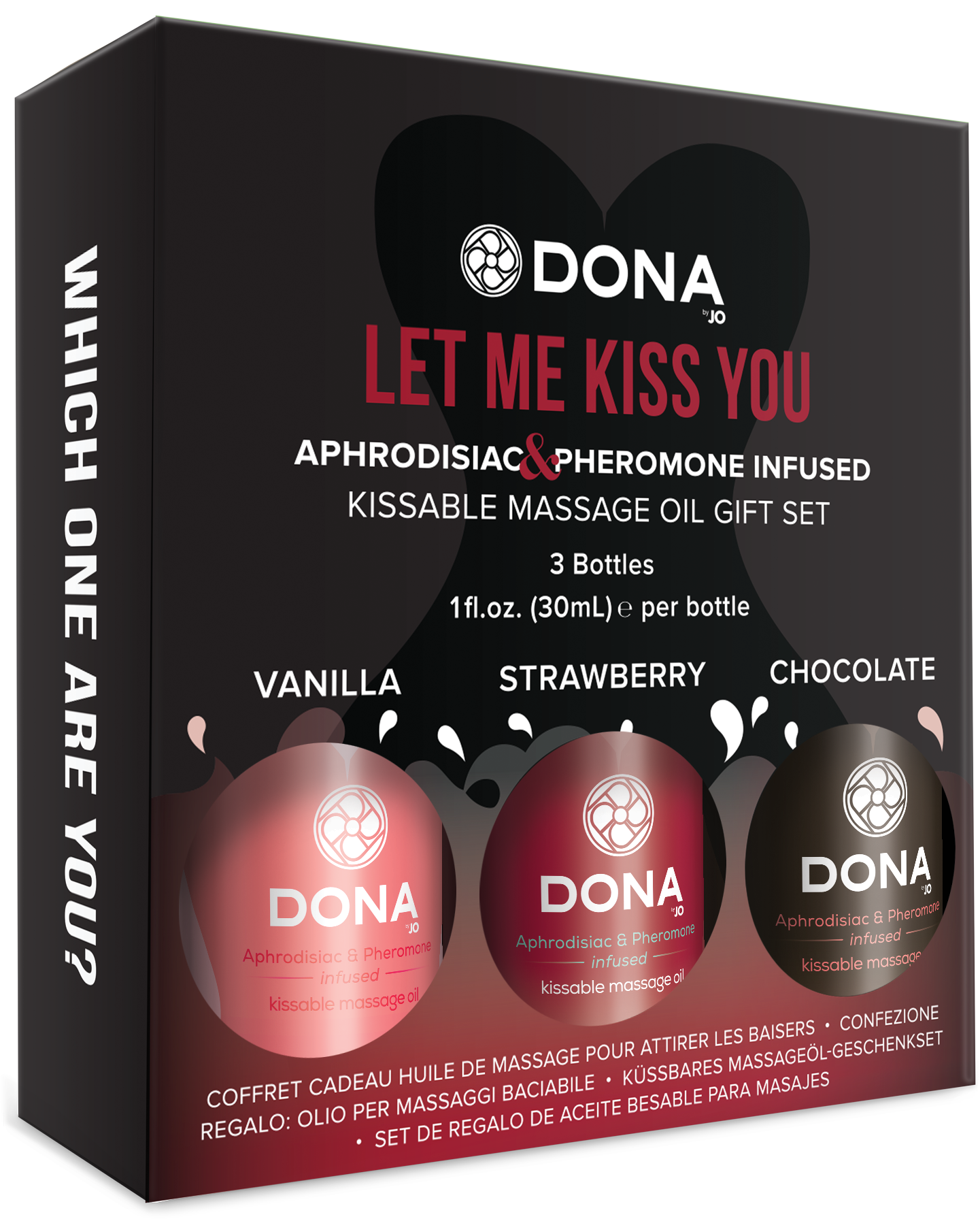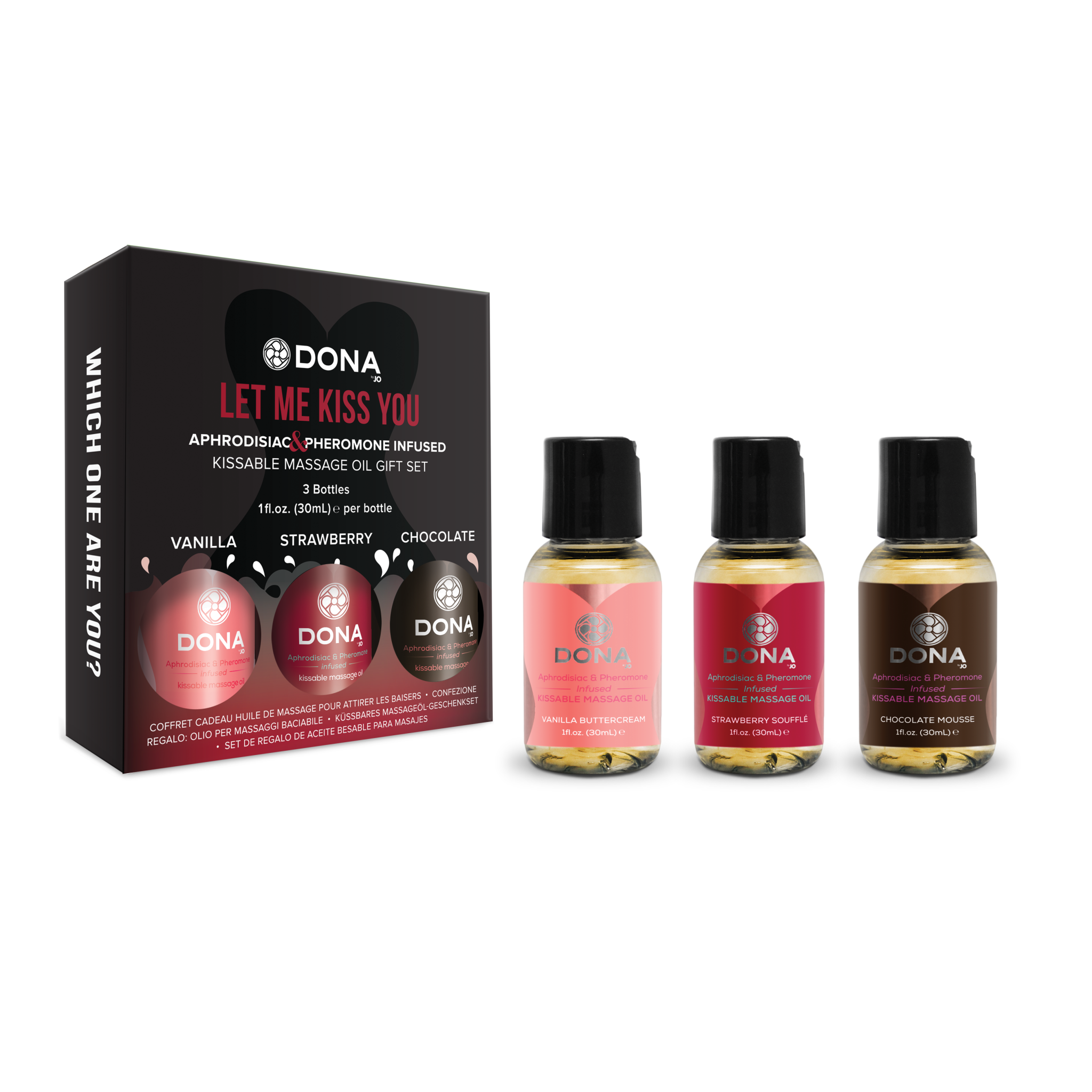 Entrance your lover with the DONA Scented Massage Oil Gift Set. In 3 indulgent fragrances