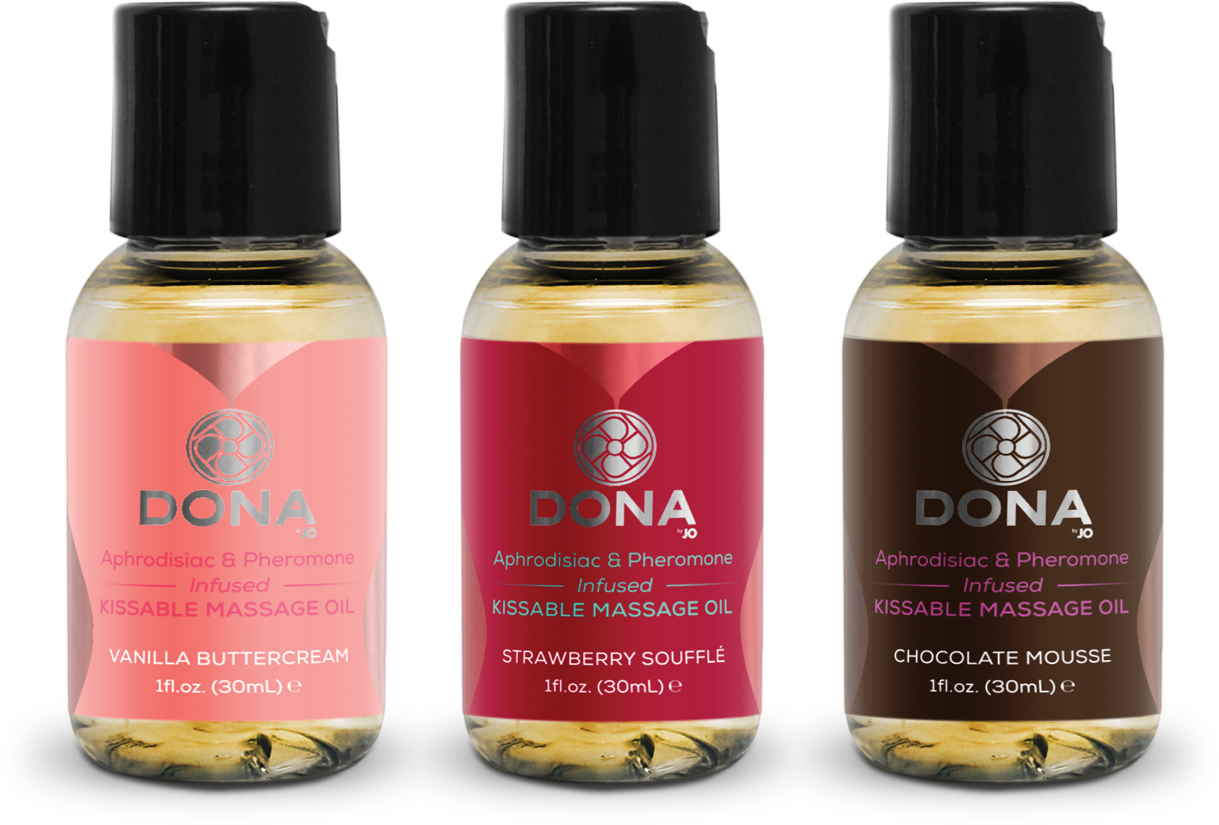 to suit all your moods, DONA Scented Massage Oil is infused with aphrodisiacs & pheromones to ignite your desire for one another while relaxing away tension.