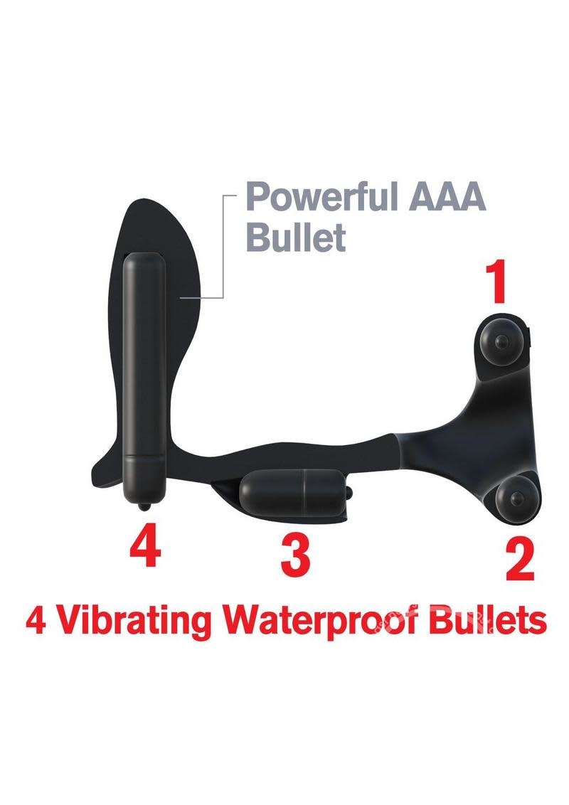 What really makes this ring so special is the strategic placement of four vibrating bullets! One bullet sits on the top ring for direct clitoral stimulation, one sits in front of your boys for an incredible ball buzz, one sits inside the ribbed perineum stimulator for a tantalizing taint massage, and one sits inside the prostate plug for wall-banging backdoor bliss! With all four bullets buzzing away, sex will never be the same again!