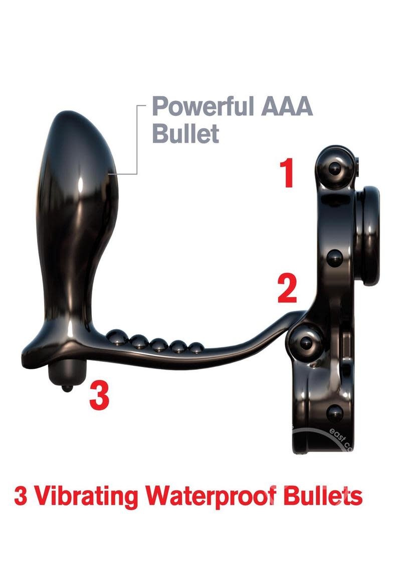 Push your package out to its maximum potential and enjoy a super tight tug on your balls while the vibrating prostate plug makes you cum harder than ever before. With 3 waterproof micro bullets powering the pleasure and providing the fun, this is the ultimate vibrating ring that will blow both of your minds!