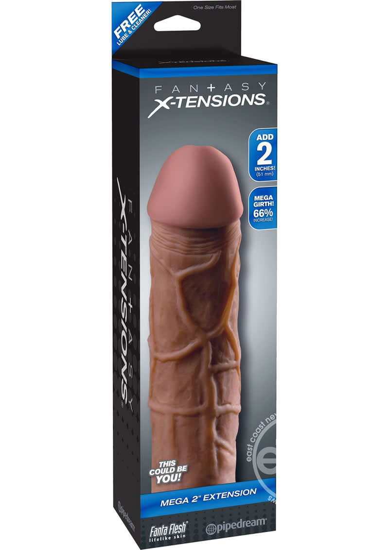 The Mega 2" Extension is a customizable extension that can be easily trimmed at the base for a perfect fit. It's super-stretchy to accommodate most sizes and snug enough to help you last longer. Your partner will enjoy deeper penetration with the 2" extension at the tip, while the ultra-lifelike shaft makes you 66% thicker all around. The soft Fanta Flesh material feels just like a second skin, giving you the length, girth, and confidence you need to satisfy your lover.