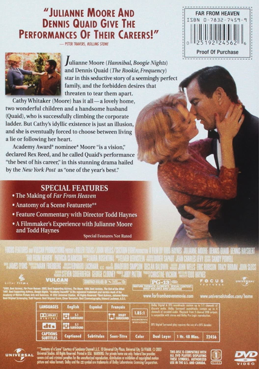 Julianne Moore (Hannibal, Boogie Nights) and Dennis Quaid (The Rookie, Frequency) star in this seductive story of a seemingly perfect family, and the forbidden desires that threaten to tear them apart. Cathy Whitaker (Moore) has it all - a lovely home, two wonderful children and a handsome husband (Quaid), who is successfully climbing the corporate ladder. But Cathy's idyllic existence is just an illusion, and she is eventually forced to choose between living a lie or following her heart.Academy Award nominee Moore "is a vision," declared Rex Reed, and he called Quaid's performance "the best of his career," in this stunning drama hailed by the New York Post as "one of the year's best."