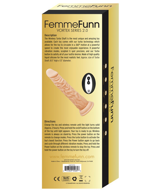 Turbo Shaft from our Vortex Series .Vortex series is our most traditional pleasure set. Sculpted to replicate the human body. Its realistic feel and sculpted g-spot precision will bring you to life with 8 vibration modes and 360 degree motion. Its Turbo button will surge you to climax. Premium liquid silicone. USB rechargeable. Wireless Remote Control. Standby mode. Harness Compatible. Dimensions: 8.2 inches long, 7.7 inches insertable, 1.5 inches wide.