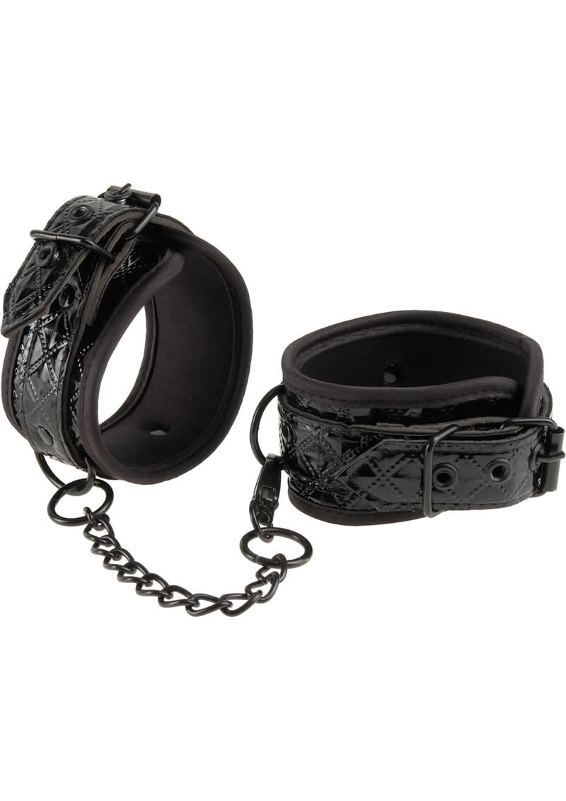 Reminiscent of your favorite designer bags, these exquisite Couture Cuffs bring the fetish fashionista's fantasies to life! Lined with velvety-soft neonprene, these heavy-duty vinyl cuffs feature an elegant textured diamond pattern to keep your lover comfortably constrained and looking sexy. These cuffs are made to play hard with super-sturdy metal hardware and buckle closures to ensure they won't escape anytime soon.