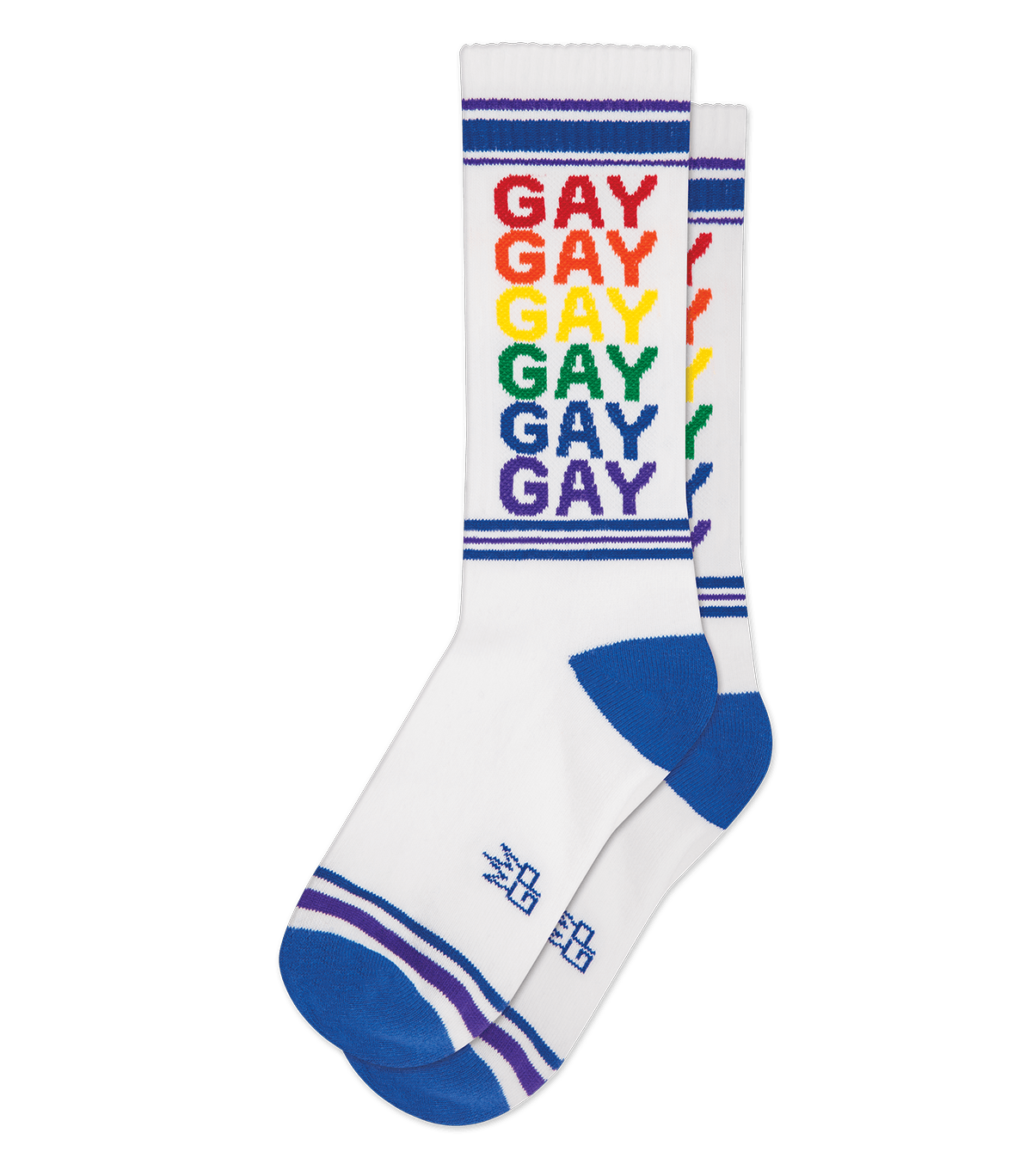 Show your pride with these retro-inspired rainbow GAY gym socks. Be GAY in every color of the rainbow!