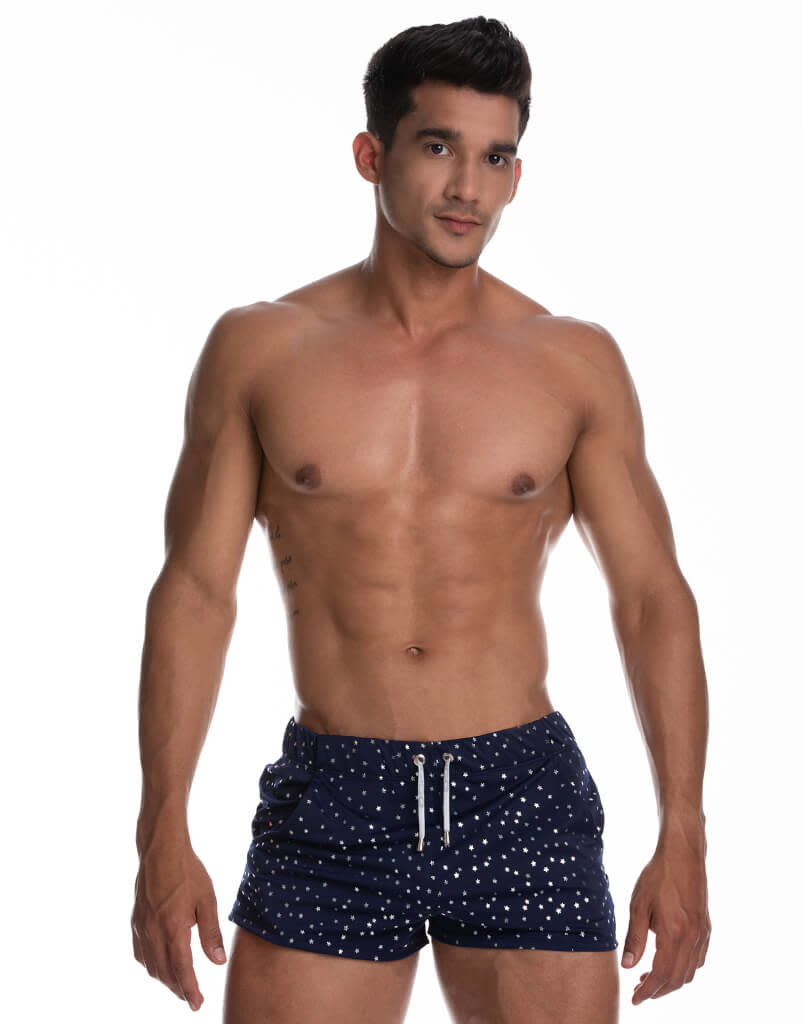 STAR short swim shorts , with starry print, pockets on both sides of the garment, internal briefs that will give you a better shape, countermarked button on one side of the front, it also has an internal drawstring that will give you a better fit 96% POLYESTER - 4% SPANDEX