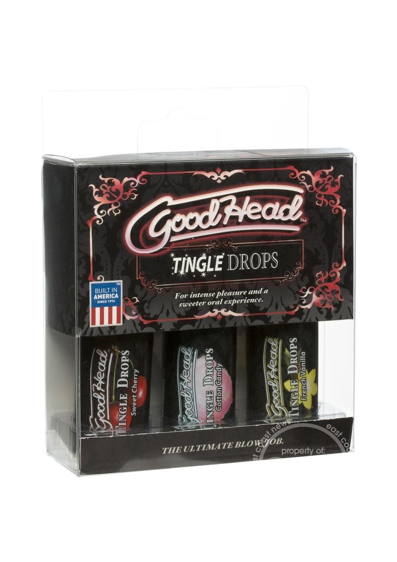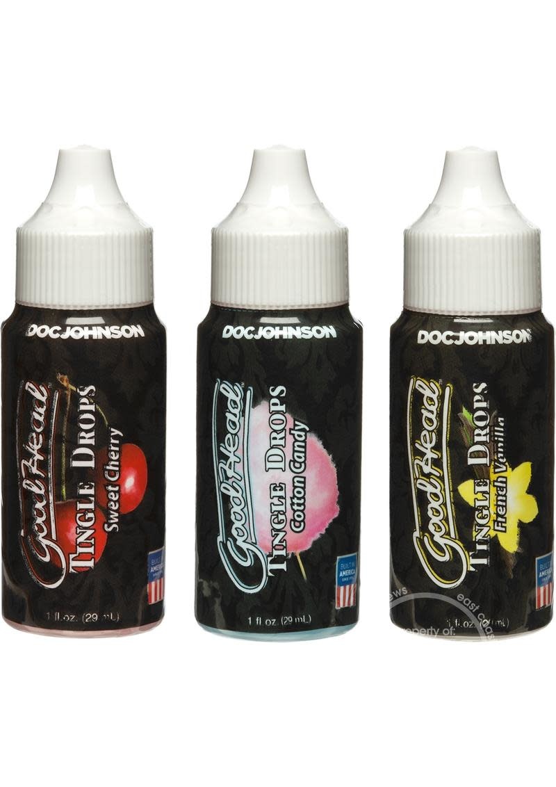 Tingling, tantalizing sensations and three delicious flavors enhance your oral play in this three-piece set of GoodHead Tingle Drops. The tastes of smooth French Vanilla, sugary Cotton Candy, and juicy Sweet Cherry are packed into 1.0 fl. oz. dropper bottles of these oral sex enhancers formulated to create a cool tingling sensation on contact.