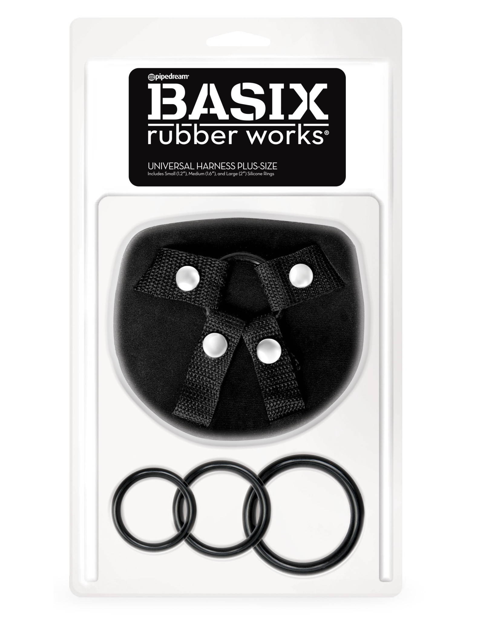 The BASIX Universal Harness is available in Regular and Plus-Size and includes 3 silicone rings. Easy to adjust and fun to use for sexy strap-on play. Most of our BASIX dildos are Strap-On ready and Harness Compatible. Includes small (1.2") Medium (1.6") and Large (2") Silicone rings.